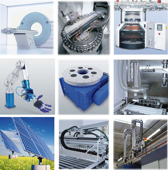 Franke產(chǎn)品在太陽(yáng)能、醫療、紡織、玻璃、木業(yè)、石材、環(huán)保、機床、食品、包裝、自動(dòng)化、航空航天等行業(yè)擁有廣泛的應用。在一些行業(yè)擁有獨特的優(yōu)勢,例如:計算機X射線(xiàn)斷層掃描成像儀(CT)、加工中心、紡織機、芯片制造機器、旋轉式分度臺及機器人等。